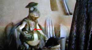 | 『クローンの攻撃』のタトゥイーンのシーン。『ファントム・メナス』に登場していたワトーが、再び登場する。 そのあごには無精ひげがボウボウ生えており、破産したワトーのその後の苦労とすさんだ生活が想像される。 そして注意すべきは、ワトーのキバである。 『ファントム・メナス』のワトーの左下のキバは折れていた。すなわち、ワトーには三本の牙が生えていた。しかし、『クローンの攻撃』のワトーには、左上のキバが見当たらない。 右上の画像のように、劇中のワトーの表情は右側からとらえた映像が多く、ワトーの顔の左側は短時間しかうつらないが、左上のキバが見えない(おそらく)。 その一方で、ワトーは興味深いペンダントをしている(右上画像、赤矢印)。すなわち、白いキバのペンダンである。 |