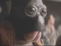 | 『新しき希望』 オルデラーンへ向かうために、パイロットを探しにカンティーナ(酒場)に入るオビ=ワンとルーク。 ルークは一杯ひっかけていると、隣にいたドクター・エヴァザン(写真1)が、言いがかりをつけてくる。 「生意気だとさ」と、ポンダ・バーバ(写真2)が、ルークのことを気に入らないと言っていると通訳してくるが、「おれも気に入らねえ」と、エヴァザンも怒りを表明する。「なめるんじゃねえぞ、俺は12の星で死刑が決まっている」とさらに、つっかかってくるエヴァザン。「気をつけるよ」とそっけのない態度をみせるルークに対して、「殺してやる」と怒り出すエヴァザン。「相手は子供だぞ、一杯おごごろう」とオビ=ワンが仲裁に入る。その時、突然切れたエヴァザンは、ルークを投げ飛ばす。 次の瞬間、オビ=ワンはライトセーバーを抜き、床にはポンダ・バーバの右手とブラスターが落ちている。 このシーンに関して、「最初に言いがかりをつけたのは、ポンダ・バーバだが、その後いちゃもんをつけたのは、エヴァンサである。エヴァンサではなく、ポンダ・バーバを切り捨てたのはおかしいのではないか」という批判がある。 |