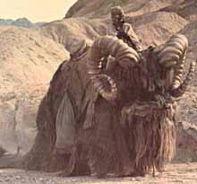 | タスケン・レイダーとバンサ 『新しき希望』でルークを突然に襲撃した砂漠の盗賊タスケン・レイダー。そのタスケン・レイダーと彼らが乗り物として使う大型動物バンサ。彼らもまた、不分離な関係である。 以下、オフィシャル・スター・ウォーズ・ホームページのサンドピーブルの解説部分の直訳である。 「サンド・ピープルは、彼らの乗り物であるバンサと非常に象徴的な共生関係にある。サンド・ピープルは、飼っていた自分のバンサを失うと不完全な存在とみなされ、彼らの集団から追放される。同様に飼い主のレイダーが死ぬとバンサは自滅的ともいえる狂乱状態に陥り、そのバンサは砂漠に放た、生きるも死ぬもバンサ次第となる。」 オフィシャル・ページに「共生関係」という言葉が直接に使われているのだ。 |
