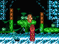 またシェルカルゴとは別に、床の氷を破って蛇のようなニスベが飛び出してくる。こいつに食いつかれたり、床に開けた穴に落ちると、画面が切り替わって水中エリアに行ってしまう。 |