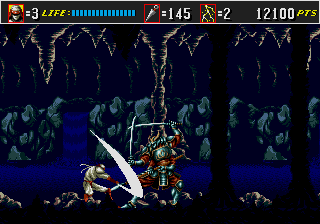 多彩かつスピーディーなアクション 『ザ・スーパー忍II』は基本的に前作『ザ・スーパー忍』のシステムを踏襲しているが、よりスタイリッシュなアクションが追加されている。中でも大きなものはダッシュ移動で、これによりゲームの進行が格段にスピーディーになった。また、そこから繰り出すダッシュ斬りは攻撃力が高い上に無敵時間があるため、敵をバッサバッサと斬り捨てながら、ステージを爽快に駆け抜けることができる。それ以外にも、飛び蹴り、三角跳び、ぶら下がりといったいかにも忍者らしい新アクションが加わり、さらに刀による防御も自由にできるようになった。 『ザ・スーパー忍II』の素晴らしい点は、これらの多彩なアクションを使いこなすことで、プレイヤーそれぞれが自分なりの攻略法を追求できるところだ。例えば、遠距離から手裏剣を投げるか、近づいてダッシュ斬りで両断するか。はたまた、敵の攻撃を刀で防御するか、ジャンプでかわして飛び蹴りを叩き込むか。安全な攻略や美しい攻略など、ひとつの局面に対して取れる選択肢が多く、自由度の高いアクションが楽しめるのだ。