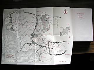 2枚の折込み地図(中つ国全体の地図と、ローハン・ゴンドール・モルドール周辺地図)は、 A3程度の大きさ。 各々、本の最初と最後の見開きにくっついており、 保護の為、出荷時は開かないようにしてるのか、 購入時の状態では薄い糊張り (両面テープかな?)で閉じられていたので、 できるだけそれを慎重にはがす。 薄くはがれやすくはなってるんで、 あせって外さなければ地図に傷つくことはないのだろうが、 気が流行るんでついつい強引にはがしそうになって傷つけそうになってしまうも(^^;、 無事開くことができました。大きくて見やすくてグッドな地図です。