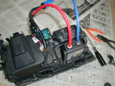 そして装着 純正HIDのバラスト装着スペースにIN 配線の取り巻きもなんとか!? 抵抗は後に考えよう〜 そして元に戻して光軸調整で完了ッ 多少夜が楽しみになったかな? 今更ジローなんであまりはしゃげない(爆) |