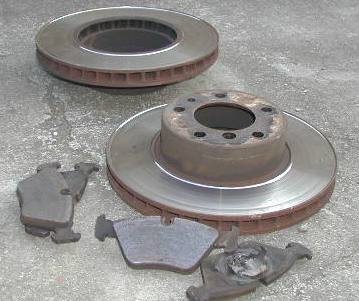 | 取り外されたローター&パッド、 ローターの耳が立ってしまっています、交換の サイン、パッドはまだ使えそうでしたが、 ダストフリーの物と交換、これでホイールの 汚れも解消?でも効きは・・・・・ |