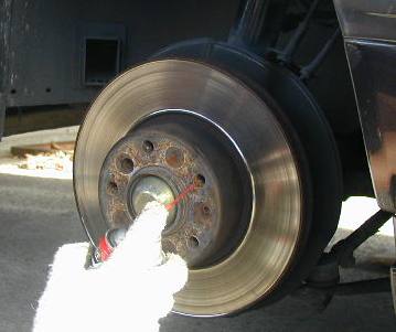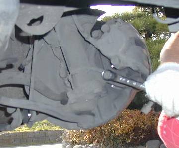 | タイヤを外したら次にキャリパ-を外します、 裏側から2箇所、ボルトで留まっています。 キャリパ-が外れたら、ホースを痛めないように キャリパ-自体を紐で釣るか、台の上に 載せます。(画像なし) |