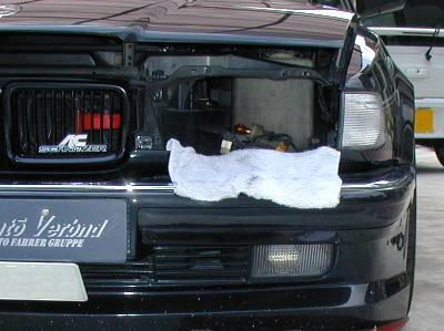 | 作業開始!先ずはライトグリルを外します。 | そしてライトユニット、前からネジ3本、裏から2本で 装着しています、先日ボンネット交換作業でバラシ経験済み なので問題ありません、ただ裏からのネジ、黙視は出来ますが 外すにはちょっと大変?手前のリムーバーのタンクのネジを はずして多少でも手の入るのスペースを確保、配線関係も出来る だけ外しておくと比較的やり易いでも殆んど 手探り作業(辛)。 |