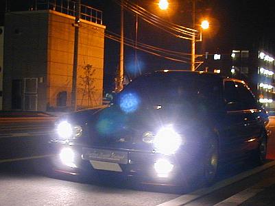 | 光軸調整の為、早速出動! ヒゲ付きライトにしたら以前とは比べものに ならない明るさ!!大満足じゃー! 因みにバルブデータはHIDと言いたいとこだが PIAAのエクストリーム(1っちゃん高いヤツ) いわゆるニセノン(涙) |