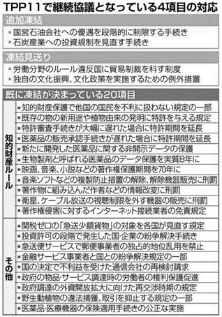 とはいえ、TPP12とTPP11の間には、やはり違いもある。下の表は、TPP12で盛り込まれながら、TPP11では「凍結」された項目である。神田さんによれば、その多くは米国が要求したものだという。