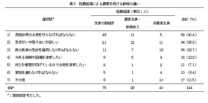 農業を続けている動機については、就農経緯による違いが出ている(次頁、表3)。農家出身者とりわけ生家の跡継ぎの中では「先祖伝来の土地を守らなければならない」が圧倒的に多く、加えて「生きがいや張り合い」が副次的な意味を持つ。ところが、非農家出身者では「自分自身の生計を維持しなければならない」が最も多い。ただし、農家出身者と同様「生きがいや張り合い」も重視している。その他、自由記述欄には例えば次のように記されている。盗人猛々しいが、これらの言葉を以て、まとめに代えることとする。