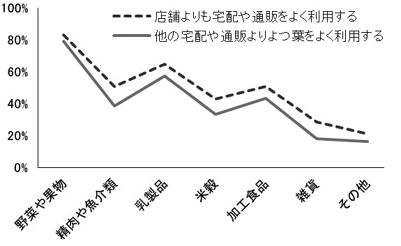 ふだん野菜や果物を購入するときに重視していることについて、アンケートでは皆さんに選択肢ごとに順位を付けるようお願いしたが、それを点数化して集計したところ、第1位から順に「旬のもの」「健康に良さそうなもの」「作りたい料理に必要なもの」「美味しそうなもの」「お買い得なもの」などとなり、一般的な消費者に比べて特に旬と健康を重視していることが伺える。さらに、回答者の多くは、野菜や果物を購入する際に一般小売店や他の宅配・通販業者をあまり利用していない(図2)。
