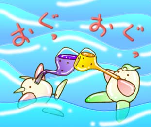 あ、この2匹はゼリーの海の中でベシャベシャになりながら、ベシャベシャに飲みまくっているのです。パソコン買った当初、私は「ゼリーシリーズ」ばっかり描いていたなぁ……。ハウスのゼリエースが好きでね……。あれを見てるだけでお話が作れるよ、私は……。 |