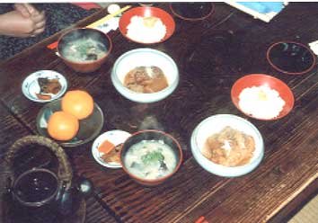 蜜柑みたいなのがポンカンで、これの左上にあるのがお漬け物。その右隣が薩摩汁。私は昔「豚汁にサツマイモが入っているのが薩摩汁」と言われたことがあるのだが、サツマイモは入っていなかった。今まで騙されてたらしい……。その右隣のご飯は粟が入っている粟ご飯で、ご飯の上にサツマイモが載っていた。ご飯とお汁の間の、下の方にあるのが豚骨。骨が肉から箸で離せるほど煮込んだ物で、味噌味だった。