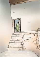 アクシーブバードとは「アク=古い」「シーブ=神聖な」「バード=師父」の意で、ヒワの中でももっとも古い場所だ。 昔、ここに1人の聖人が現れた。皆はここに集まり、聖人に会って祈りを捧げた。その後この地がヒワ・汗国の首都となり、アクシーブバードは砦の一部にされた。17世紀以降になると、ここは軍の施設の一部として利用されることとなる。 このイラストの右端の方にごつごつとした岩の様な物が見られると思うが、ここはオリジナルの、聖人が来た当時の壁をそのまま残している。それ以外の場所は全て後に修復されている。 一般に、「必ずこうであった」と証明できる場合を除いて、遺跡の修復は2/3迄とし、必ず遺跡の1/3はオリジナルのまま残しておかなければいけない。しかし、この遺跡の修復の度合いを考えると、そんなことが決められる以前に修復し、オリジナルの部分は修復するほどでもないし、まぁ記念だからこの一角は手つかずに残しておこう、と言った程度に残してあるような気がする……。まぁそういった国際ルールは近年出来た物だから仕方ないけど(って、あくまでも私の感想ですが……) 見晴台へと続く階段は狭い上に暗くてしかも1段1段が高い。結構怖い階段だ……。
