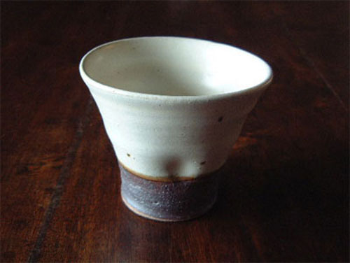 焼酎用に作ったカップです。乳白色のマットな上薬であたたかみのあるカップで、手になじむくぼみが特徴です。 焼酎以外にも多目的湯呑みとして使えます。