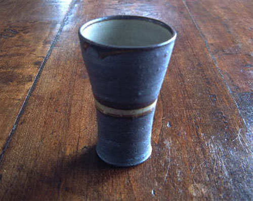 内側にグレーがかったマット釉が施してあり、外側は鬼板(酸化鉄)を刷毛塗りしています。中央にマット釉でグレーのラインがはいってアクセントになっています。