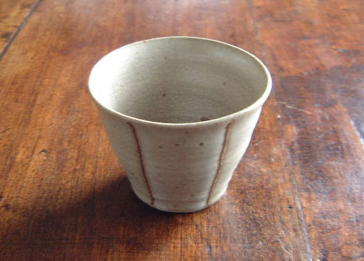 鬼板(酸化鉄)の線模様を象嵌で施し、マットな釉薬を掛けました。小さめのそば猪口のようなカップです。
