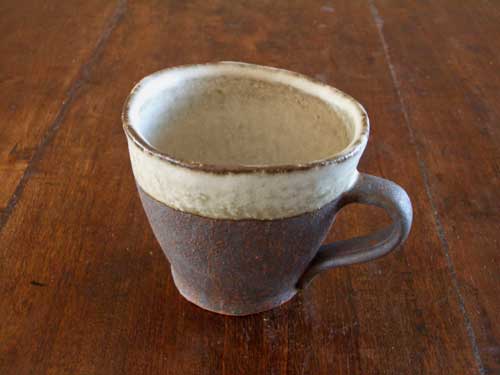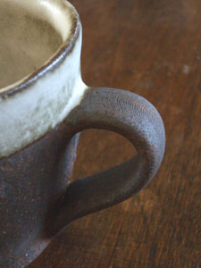 手びねりで少し大きめのカップをつくりました。外側は口のあたるところまで釉薬をほどこし、その他は土っぽさを残しました。おそろいの手つき鍋でミルクを温めて飲むのが寒い季節にぴったりです。