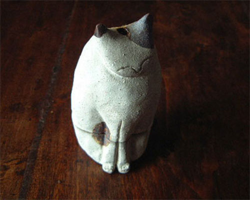 猫の形をした香炉です。中が空洞になっていて、魚の形の香立てが入っています。これは三毛猫バージョンです。
