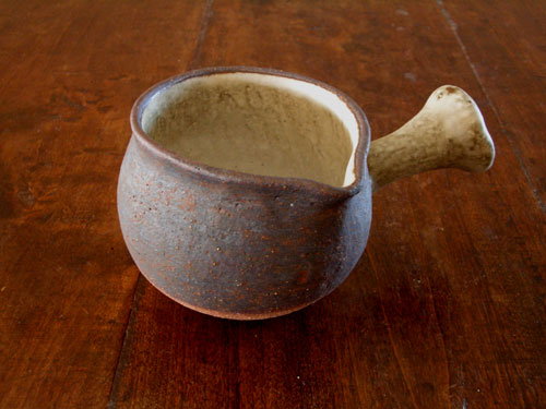 細長カップ、マグカップとおそろいの手付き鍋です。大きさは大・小の2種類あって、大が飲み物3人分、小が一人分ほど入ります。耐熱土を使っているので、火にかけられます。飲み物だけでなく、少量のスープやおかゆを作ったりするのも可能です。