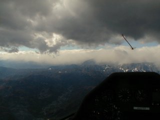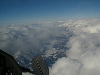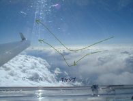 その後再度ギャップへダイブして旋回せずに高度を取りながら南下を開始しました。去年の春は中央アルプスの上昇帯につなげられなかったのですが、今回はギャップが明確にあり、17000〜18000FTで120K程度で巡航できました。雲の切れ間から三和ダムが見えます。遠く、下に富士山も見えます。南アルプスにもウェーブが発生していてギャップが確認されました。時間に余裕があれば確実に移行できる感じでした。しかしそろそろ2時40分、松川ICで折り返し帰ることにします。東へ向かい第2波の整流を利用しながら200Kで北上。北アルプスの第2波付近で激しいシアを感じ120Kに減速。我慢できず妙高へ北上します。習慣でついウェーブの整流を使ってしまい、高度処理できません。17000FTで妙高をクリア。3時20分をまわっています。何とかして降りたいのですが、長野上空のウェーブも非常に強く、200K出してもプラスに振りきるほどなのです。脚を出して沈下を増します。 ローターのマイナスを探してもみくちゃにされながら、、、なかなか下がりません。ウェーブの整流の沈下を探してマイナスの強いところに必死のセンタリングです。