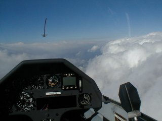 昼前に離陸。エンジンを使用して6500FT、長野西の小川付近でローターと思われる雲の東端に到達。おだやかな1位の上昇と周りの3−4のすごい沈下に閉口しました。山岳地帯で標高が高く、うかうか飛んでいられません。ウェーブははずれか?と思いながらもだましだまし高く遠くに見える青木湖を目指します。雲の西側に届き、ようやく大気が荒れ出してローター雲であることを実感しました。