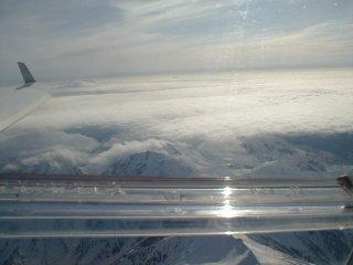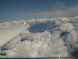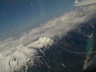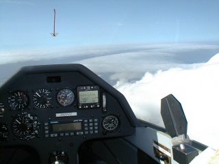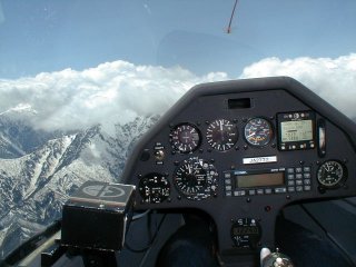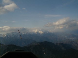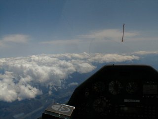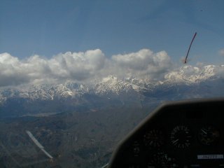 今日は風が弱く、山寄りで整流域にはいる。1.5位で南下を始める。穂高辺りまでは何とかラインがつながっていたが、木曽駒ヶ岳の辺りは非常に弱く、高度をやっと維持できる程度。泰阜ダムがTPである。今日は風が弱いため、ウェーブの沈下帯の中になっていた。太平洋が確認できる。−5の中クリアしてやむを得ず風下の南アルプス側の雲道を伝って北上する。高度も9000−8000と下がってくる。やっと中央アルプスのローターの雲道に入れた。しかし整流域にはわずかしか入れない。上がりも悪い。数十キロ先の北アルプスはウェーブがまだ生きている。ローターをひろいながら北上する。