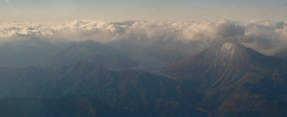 宇都宮飛行場横から日光からのびる雲道までしばらく直線飛行し、徐々に高度を上げ中禅寺湖を拝む。しかしこの荒れ方はローター以外ではない。