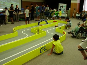 カーか何かのデモをやっていたようだ。子供工作教室では線をなぞりながら走るロボットカーを組み立てていた。