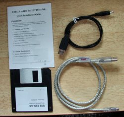 添付されているのはUSB2.0のケーブルと電源を取るためのUSBケーブル、Windows 98,SEで必要なドライバーの入ったフロッピー。それと英文のマニュアル。