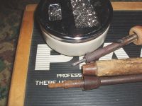 奥の丸い物体は、灰皿とセットの「タバコ&ライター立て」に、金タワシを入れて、コテ先クリーナーにしました。