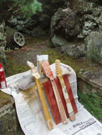現在の悩みは、手前の同じく中学の技術で作ったゲンノウのねじ込み木地グリップが割れてしまって、代替品が見つからないことです。