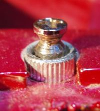 後期STM等の二点支持ブリッジでアームの稼動範囲を最大にする場合、弦と裏バネを外して、左手でアームダウンさせたのと同じ状態を保ってブリッジをスタッドスクリューに軽く押し付けながら、スクリューを上下させます。(押し付け過ぎると、スクリューにナイフエッジで傷が付きます)