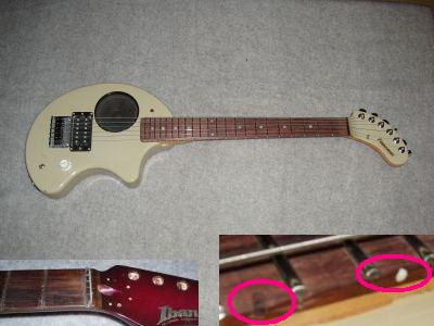 @ボディとネックは、それぞれ別のフェルナンデス製(ネックは、オールドコピーの結構良い物みたいだが、「ロックナットを付けかけて戻してある」。ロゴは最初から張ってあった)