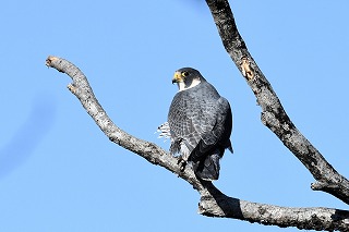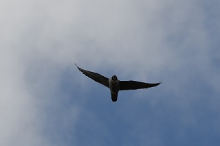 | 鎌のような・・(2026/02) 晴れ渡った、でも少し風が強い日にハヤブサを見に行きました。いつ見ても、どう見てもカッコイイと思ってしまいます。「ハヤブサ」という名称は「はやいつばさ」に由来するとのことですが、英語の「falcon」の語源は「鎌」を意味するラテン語だとされているそうです。確かに飛んだ時の翼も鋭いかぎ爪も鎌形です。 |