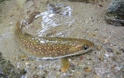 9月:(多分)ニッコウイワナ 9月、禁漁間際に出会った、那珂川水系K沢の25pのイワナ。体側にあるオレンジ色の丸い紋様が実にきれいでした。昨今天然の混じりっけないニッコウイワナに出会うのは難しいと言われています。この一尾がそれとは断定できませんが、美しい姿形としなやかな動きに見とれると、そうであってほしいと思うのです。 |