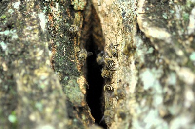 | 10月:ニホンミツバチ 10月、那須山中での散策途中、頭上でプンプンと小さな羽音がしました。音のする方を仰ぎ見ると、いくつもの小さな黒い影がひっきりなしに大木のうろを出入りしていました。ニホンミツバチです。天然木での巣は初めて見つけました。感激です。しばらく観察していると、キイロスズメバチが飛んできました。近づいて襲う気配もありましたが、その都度巣の入口近くの働きバチが体全体をふるわせて警戒したため、あきらめたようで遠のいていきました。このままここを放棄せず、営巣を続けてほしいと願うばかりです。 |