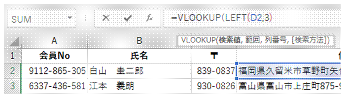 VLOOKUP関数を使って、都道府県名に該当する送料を検索します