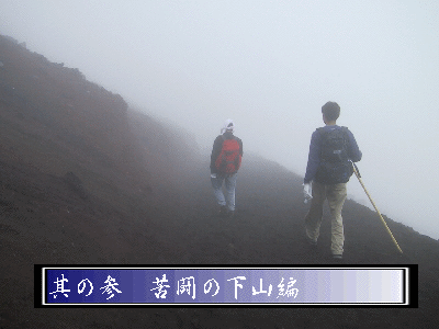 名残惜しく・・はなかったが、山頂から離れることに・・。景色がほとんど見えなかったのが心残り・・。 相変わらず真っ白な下山道を下ることとなったが、ここからが新たな苦難の第一歩になるとは知る由もなかった。 河口湖口では登山道と下山道は分かれており、登山道は岩場を登るのに対して下山道は30mぐらい下ると折り返すジグザクの道がひたすら続く。そして登山道には山小屋がたくさんあり、標高などの案内板が多数あったが下山道には皆無。 普通は登りの方が体力を使うように思われがちですが、下りは足でブレーキをかけながら全身でバランスをとるのと下り続ける間、絶えず緊張感を強いられるので疲労度は想像以上。それに普段運動しない人が標高で1,400mを登った後、ただでさえ疲れているのにまた同じ高さを下るのだから尚更です。 途中ですれ違った家族連れも子供はいつまでも続く下り坂でくずり出してるし、外国人に「あとどれぐらいで六合目につくのか?」ともちろん英語で聞かれたが、「I don't know・・」こっちが聞きたいくらいじゃ! 行けども行けども下り坂、もううんざりな状況でした。 下り坂にも変化が出始め、コンクリート製の落石防止のシェルターを過ぎた頃から道がなだらかになる。 そしてようやく山小屋「穴小屋」に到着。山小屋の存在で先行きが見えてきたので安心感がある。 五合目まではあと少し・・。 |