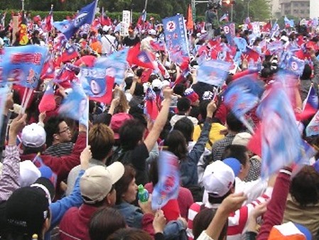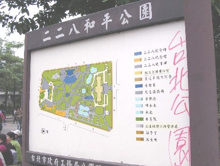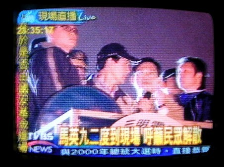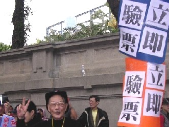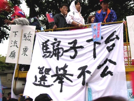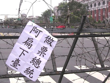 投票日翌日の21日は日曜日で、総統府前の国民党支持者による抗議集会には早朝から幼子を抱きかかえた家族連れや老人の姿もたくさん見られた。 手作りのプラカードを持ち寄る人も多く、陳水扁総統をヒトラーになぞらえ抗議する大学生もいた。カギ十字の背景の緑は民進党のシンボルカラー。 陳水扁総統は、支持者から「阿扁」の愛称で呼ばれることが多い。この「阿扁」の「扁」と同じ中国語発音となる「騙」を使い、「騙子下台」(嘘つきは政権から降りろ)、「下流扁」(陳水扁は卑しい)といった厳しい言葉を書き連ねる横断幕。 1989年の天安門事件でも、中国国内では「下台」がさかんに叫ばれ、李鵬などに向けて使われた。 投票用紙の再チェックを要求した連戦国民党主席の主張を支持する「立即験票」(すぐに票をチェックせよ)というスローガン。 支持者がVサインをしているのは、連戦国民党主席は選挙登録が2番だっだことから、Vサインと2番への投票にひっかけ、国民党支持者は選挙中からVサインで投票を訴えていた。赤と青は国民党のシンボルカラー。 20日夜から、総統府に通じる道路は警察によって封鎖された。このため総統府に近づけない国民党支持者はバリケードに思い思いのビラを貼って抗議の意志を表した。 撮影直後、大勢の国民党支持者がこの道路にも集まり始め、バリケード内に重装備の警察が整列しデモ隊の侵入に備えた。 抗議集会では、選挙のやり直しを求めるスローガンが叫ばれるたびに、中華民国国旗「青天白日満地紅旗」や国民党旗「青天白日旗」が振られた。 時には、中華民国の正当性と永続性を訴える歌詞で綴られ、テレサ・テンも国民党軍の前で好んで歌った「中華民国頌」が合唱され、自分たちが台湾ではなく中華民国の国民であることを国民党支持者は強くアピールした。 抗議集会の現場に隣接する二二八和平公園。以前は新台北公園と呼ばれていたが、1996年に当時、台北市長だった陳水扁が二二八和平公園に改名。 21日夕方、公園の案内板に「台北公園」という落書きがなされた。現在、公園内には、国民党による本省人への弾圧を伝える二二八記念館が建つ。 「台北公園」という落書きは、台湾における本省人と外省人の対立の根深さを示しているようにみえる。 抗議集会二日目となった21日、警察は午後10時までに解散を命じたが、集会は続いた。このため、馬英九台北市長が集会壇上で「明日は仕事も学校もあるから帰宅するように」と訴えたが、参加者は無視。この模様を伝える現地テレビ。 壇上で発言した複数の国民党幹部は選挙の無効や票の再チェックを強く訴えたのに対し、馬市長はこの件に言及しなかった。国民党の次期総統選の有力候補とされ、市民からの評価も高い馬市長は抗議集会にまる1日、現れなかったこともあり、彼の言動にさまざまな憶測が流れた。