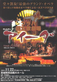 配役は、アイーダがシモナ・ザンブルノ、アムネリスがイジナ・プシーブラッカー、ラダメスがフランチェスカ・ペトロッツィという、あいにく全く知らない人ばかり、もちろん指揮者のイジー・ミクラなど、知る由もない。何でも、あのホセ・クーラがラダメスを歌う日があったそうであるが、仙台にはこのようなスター歌手は来てはくれないのだろう。オーケストラも弦が異常に少ない編成、第1ヴァイオリンが4プルトというのは、ちょっと少なすぎやしないかしら。地方都市の場合は、オーケストラピットも狭く、フル編成では入りきらないという事情もあるのであろう。事実、ここ仙台でも、ハープだけはピットに入らず、ステージの上に出てしまっていた。ティンパニも2台だけ、ヴェルディで2台というのは、奏者もたいへんなのではないか。