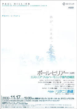 本日聴きに来たのは、バルト海に面した、かつてはソ連に属していたエストニア共和国からやってきた「エストニア・フィルハーモニック室内合唱団」である。創立者、トヌ・カリユステの指揮によって、世界的な名声を博してきたこの合唱団が、昨年からあの「ヒリヤード・アンサンブル」の創立者であったポール・ヒリアーを常任指揮者兼芸術監督に迎えたという。この、まさに夢のような組み合わせでの演奏会が、ついに日本でも聴かれるようになったということである。しかも、この合唱団が深い関係を築いてきたこの国の作曲家、アルヴォ・ペルトの、オーケストラが入った大規模な作品の日本初演も行われるということで、現代音楽ファンや合唱ファンにとっては、絶対に聴き逃せないものであろう。会場はほぼ満員の入り、しかし客層はオーソドックスなクラシックの演奏会とはいささか異なったように感じられたのは、おそらくそのあたりが原因なのであろう。