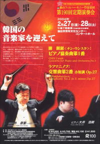 会場の青年文化センターは、2年ほど前にさる合唱団の「マタイ受難曲」を聴いた場所である。あの時は観客が殺到して通路に座る人まで現れ、中にはホール内に入れずに払い戻しを受けた客もいたという。元々それほど大きなホールではないのだが、開演間近に中に入ってみると、かなり空席が目立っていたのは、多少意外であった。私はこのオーケストラの定期会員でもなんでもないので、普段の定期演奏会の模様はよく判らないが、同じ公演をわざわざ2日に分けて行って居るぐらいだから、本当はもっと人が入るものなのであろう。とすると、これはやはり曲目と演奏家の知名度の低さの所為なのかしらん。事実、大井が初演するというピアノ協奏曲の作曲家は陳銀淑(チン・ウンスク)という韓国の人、最近世界中で注目を集めている作曲家のようであるが、私でさえ彼女の作品は全く聴いたことがないほどなのであるから、無理もないことであろう。さらに、指揮者が、朴恩聖(パク・ウンソン)というやはり韓国の人であれば、おそらく知名度の低さという点では極めつけではないか。ひょっとしたら、この中では大井がある意味最も有名なのかもしれないなどと、やや寂しい感慨にふけってしまったものだ。