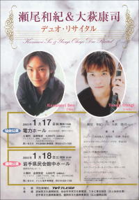 最初の曲は、ジュリアーニの二重奏曲、瀬尾のフルートがホールいっぱいに響き渡った時、彼が2年前とは各段の進歩を遂げていることに気づかないわけにはいかなかった。確かなテクニック、スケールの大きな音楽はそのままに、音の輝きがさらに増していたのである。じつは、最初に瀬尾の演奏を聴いたときに、一つだけ不満な点があった。それは音程。瀬尾同様、外国の大きなコンクールで数多くの優勝経験を持ち、現在では日本を代表するフルーティストと言われている某氏も、やはりその音程の低さゆえに私としては評価が躊躇われるところなのだが、瀬尾にもその傾向を見て、若干不安になったことがあったのである。ところが、今回はそのような不安さは全く感じることは出来きなかった。ひたすら心地よい音程で奏でられた心に染みる歌を聴くことが出来たのは、今回、何にも勝る収穫であった。ただ、合方の大萩は、楽器自体の性能もあるのだろうがいささか音量としてのバランスが取れていなかったのは意外ではあった。おまけに、瀬尾がいとも軽やかに演奏しているのに比べて、大萩の、ほとんどたどたどしいとしか言い様のない冴えのなさは、一体どうしたことだろう。明らかにテクニック上の破綻が生じていたのは、残念だった。