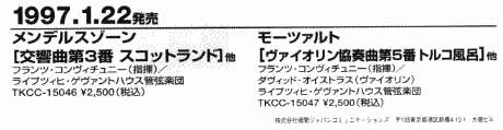 というわけで、今ではもはや誰も知っていることがなくなったこの言葉ですが、音楽の世界ではいまだに日常的に使われているのです。モーツァルトが作った5つあるヴァイオリン協奏曲の最後のもの、K219というケッヘル番号を持つ作品には、「トルコ風呂」という愛称が与えられているのです。本当ですよ。その証拠に、「レコード芸術」の1997年1月号に掲載された、徳間ジャパンコミュニケーションズというレコード会社の広告をご覧になっていただきましょうか。ねっ、堂々と書いてあるでしょう。
