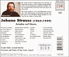 そんな中、珍しい曲を安い価格で提供してくれるということで評判になったARTE NOVAというBMG傘下のレコード会社から、「ヨハン・シュトラウス作曲、ナクソス島のアリアドネ」というオペラが発売されたのです。えっ、「ナクソス〜」って、ヨハンではなくてリヒャルト・シュトラウスの作品ではなかったの?とおっしゃる方、ごもっともです。確かに、リヒャルト・シュトラウスにも、同じタイトルのオペラがあります。ですから、ARTE NOVAも、最初は勘違いをして、このようなジャケットの製品を出してしまったのです。