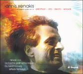 好調に製作が続いているクセナキスのオーケストラ作品集、前作の第3集が、ワイドショーにまで取り上げられ、この種のものとしては異例とも言える知名度を獲得したことはまだ記憶に新しいことでしょう。あの時に「シナファイ」という、クセナキスの最初のピアノとオーケストラの作品を見事なまでに弾ききっていた大井さんを再びフィーチャーしてのこの第4集では、2番目の「ピアノ協奏曲」である「エリフソン」を聴くことが出来ます。この曲が作られたのは1974年、私事に渡り恐縮ですが、1976年の11月に、クセナキスが来日した際に、その講演を聴きにいったことがあります。それは、もちろん彼の特異な作曲技法を自ら解説するというもの、初期のクラスターを多用した作風から説き起こして、最後の方ではその頃彼がハマっていた「木の枝」の形を作曲に応用する手法を、出来たばかりのこの「エリフソン(広大な大地)」を例にとって熱く語っていたものでした。ステージの上の黒板に、先の方が枝分かれした木の枝を描いて、「縦軸はピッチ、横軸は時間」などと言っていたのですが、正直その当時は、その発想が実際の音とどのように結びつくのかが、余りよく分かりませんでした。中には逆戻りをしていた枝もあったので、それが時間の中ではどのように扱われるのか、とか、いまいちイメージが湧かなかったのです。
