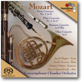 モーツァルト・イヤーの幕開けに相応しい、ロイヤル・コンセルトヘボウ管弦楽団の木管楽器の首席奏者4人が、このオーケストラのメンバーからなる室内アンサンブルをバックにモーツァルトの協奏曲を演奏したというアルバムです。ホルンのスローターは協奏曲第1番、フルートのバイノンも第1番、そして、ファゴットのヌニェスとオーボエのオグリンチェクは、それぞれただ1曲しかない協奏曲を演奏しています。アンサンブルの弦楽器の編成は5、5、4、3、1という(もちろんプルトではなく、本数)かなり小さなものです。コンサートマスターのクレジットはありますが、特に指揮者は立ててはいません。