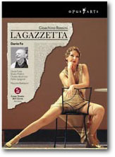 バルセロナのリセウ大劇場で2005年7月に行われた公演のライブ、1年も経たないのにDVDになりました。ロッシーニの「ラ・ガゼッタ(新聞)」という非常に珍しいオペラ、もちろん、これが世界初のDVDです。年頃の娘を持つ商人ドン・ポンポーニオが、娘リゼッタの結婚相手を求める新聞広告(ガセネタ!)を出したのがそもそもの始まりとなるドタバタ喜劇、結局リゼッタは以前から恋仲だった宿屋の主人アルベルトとめでたく結ばれるというお話です。