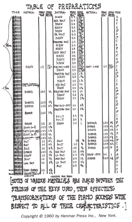 これは、この曲の楽譜の最初に載っている「Table of Preparations」、つまり、プリペアのためのインストラクションです。もちろん、これはケージ自身の手書きによるもの、この可愛らしい特徴的な書体は、彼の音楽とともに多くのファンを持っています。そんなファンの期待に応えて「ケージ・フォント」などというものを作って販売している人もいるそうですね。ちょっと小さくて分かりづらいのですが、表の上にある文字は左から「TONE」、「MATERIAL」、「STRINGS LEFT TO RIGHT」、「DISTANCE FROM DAMPER(INCHES)」、指定された音に相当する弦に何を挟むか、それは3本(低音では2本)あるピアノ線のどの間で、ダンパーから何インチの場所か、ということを、克明に指示したものなのです。一つの弦の何ヶ所にも「プリペア」が指定されていることもありますね。ですから、これに従って「プリペア」を行えば、誰でもケージがイメージした音が出せるということになります。と、あのケージにしては何とも厳密な指示を行ったものだな、と思わせられるかもしれませんが、実は「MATERIAL」にしても「ゴム」とか「ネジ」と書いてあるだけで、どんな大きさや長さなのかまでは指定はされてはいません。そもそも「DISTANCE FROM DAMPER(INCHES)」と言ったところで、ピアノのサイズが違えば弦の長さに対しての相対的な位置も変わってしまうのですから、何の意味も持たなくなってくるはずではないのでしょうか。ですから、この表からうかがえるものは、いかにも大層なことを指定しているようで、実は「適当」なことしか言っていないという、まさに遊び心満載のケージの素顔そのものだったのです(もう一つ言えば、2オクターブ目は「15度」のはずです)。