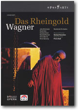 1999年、ネーデルランド・オペラのプロダクション、グレアム・クラークやクリス・メリット以外には、それほど有名な人が歌っているわけでもありませんが、演出はとても手のかかった、それでいて非常に分かりやすいものですから、存分に楽しめます。衣装が日本人の石岡瑛子さんというのも、親近感のあるもの、事実、彼女の衣装プランは我々にとって非常に親しみやすいものとなっていますから、それを味わうのも楽しいことです。なにしろ、神々族はまるで仏像のようなヒダの入った衣を着ているのですからね。それで、頭は螺髪ときてますから、フリッカなどはほとんど鎌倉の大仏様です。フライアは、まさに興福寺の阿修羅像。ただ、ローゲ(クリス・メリットが演じています)だけはスキンヘッドというのは、彼が正規の神々ではないことの分かりやすい現れなのでしょう。そうなると、○ンタマ丸出しの巨人族は、まるで木彫りの仁王様のように見えてくるから不思議です(そ、「メンタマ」を剥いてます)。